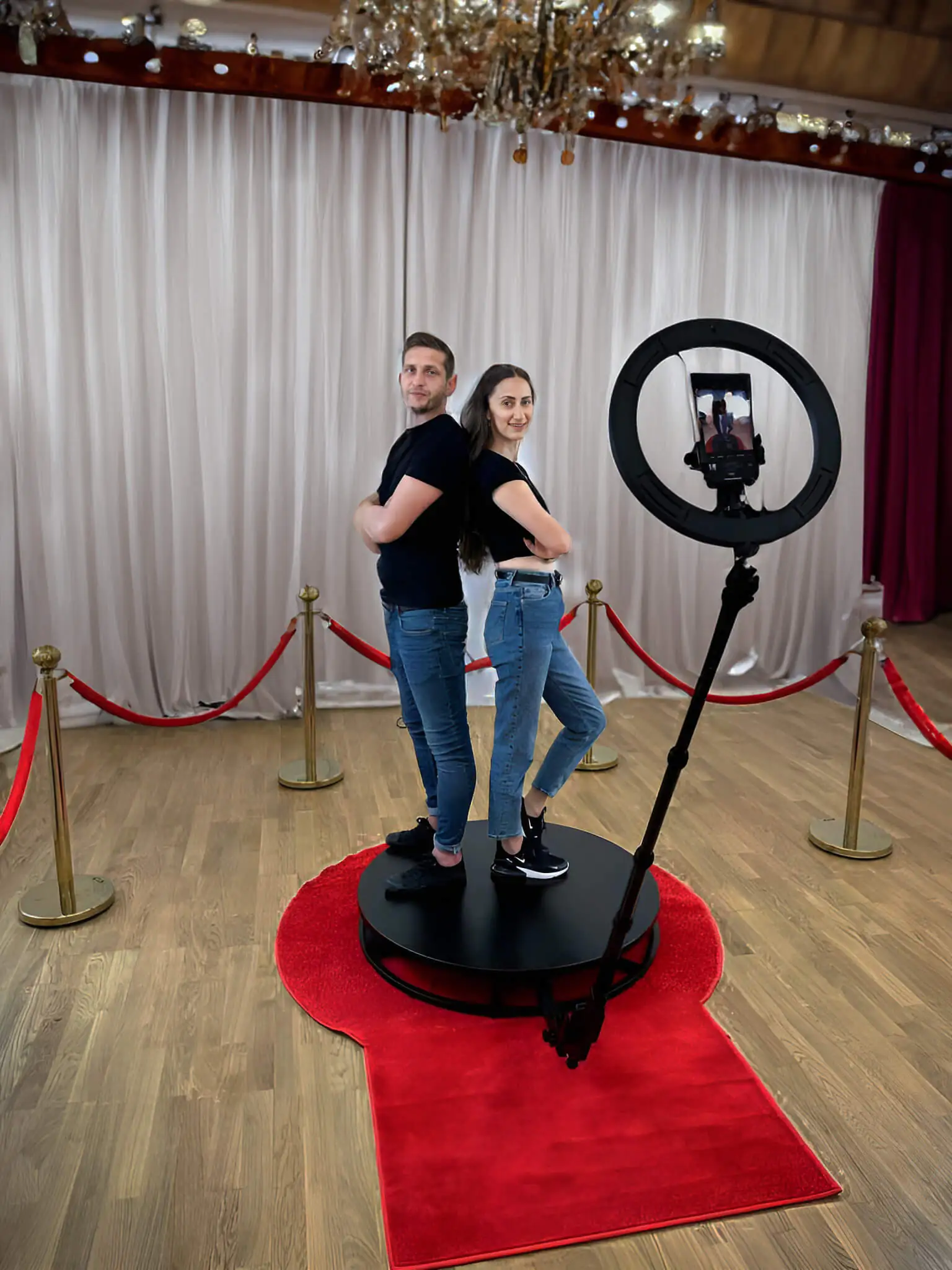 Vor der Veranstaltung klären wir die Details zur Vermietung. Wir überprüfen, ob am Veranstaltungsort (z.B. Hochzeitssaal) ausreichend Platz für die Aufstellung des Party Spinners sowie Stromanschluss vorhanden ist. Wir wählen den Aufnahmemodus aus - Bildrahmenbreite, horizontale/vertikale Ausrichtung, personalisierten Rahmen für Aufnahmen und optionale Effekte.